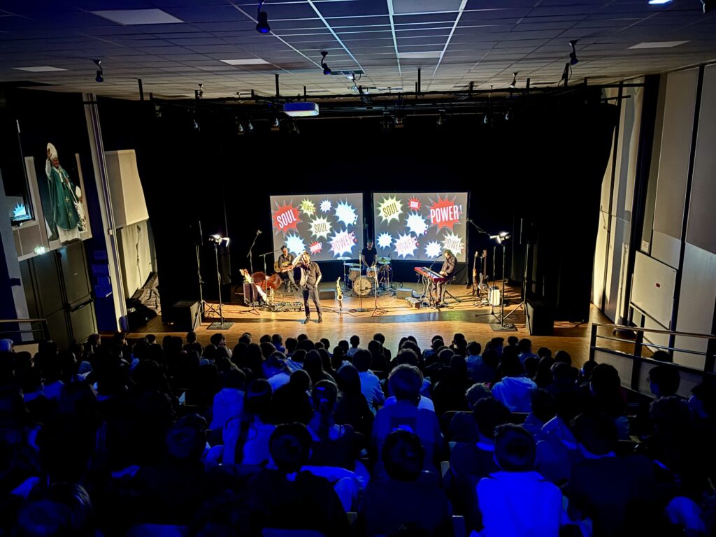 Le jeudi 5 février, tous les élèves de quatrième de l’Externat ont assisté à un concert pédagogique intitulé « Soul Power » dans la salle JPII. Ce spectacle a offert une véritable plongée dans l’univers de la musique afro-américaine aux États-Unis, depuis la période de l’esclavage jusqu’à nos jours.