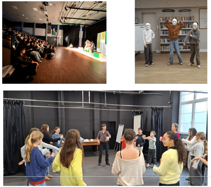 En complément des pièces, les élèves de 5e et ceux inscrits en 6e théâtre ont participé à des ateliers pratiques leur permettant de s’initier au jeu d’acteur, au port du masque et à l’improvisation !