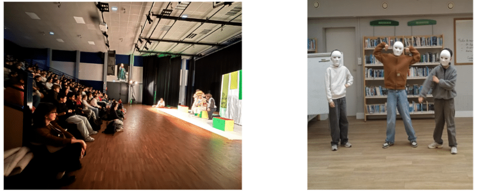 En complément des pièces, les élèves de 5e et ceux inscrits en 6e théâtre ont participé à des ateliers pratiques leur permettant de s’initier au jeu d’acteur, au port du masque et à l’improvisation !