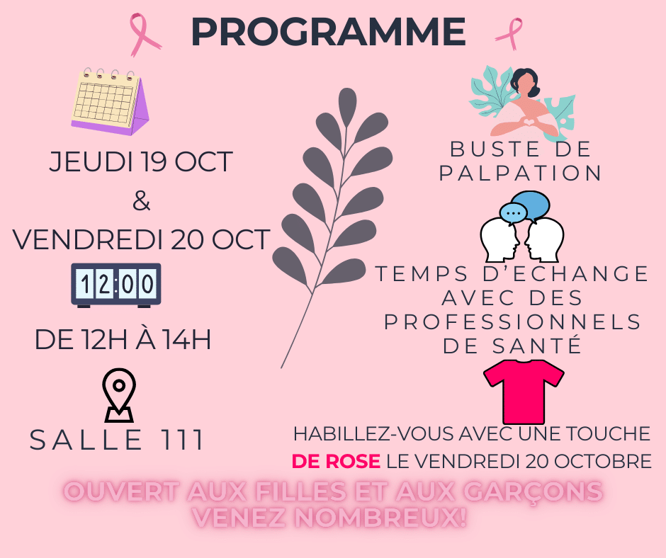 Le cancer du sein est le cancer le plus fréquent en France et représente la première cause de décès par cancer chez la femme. C’est pourquoi il est important de ne pas avoir peur d’en parler et de s’informer. Il est nécessaire d’adopter les bons réflexes comme le dépistage, qui peut sauver des vies. Les ateliers ont eu un franc succès auprès de nos élèves, plus d’une centaine de jeunes est venue s’informer. Ils se sont montrés intéressés et curieux !
