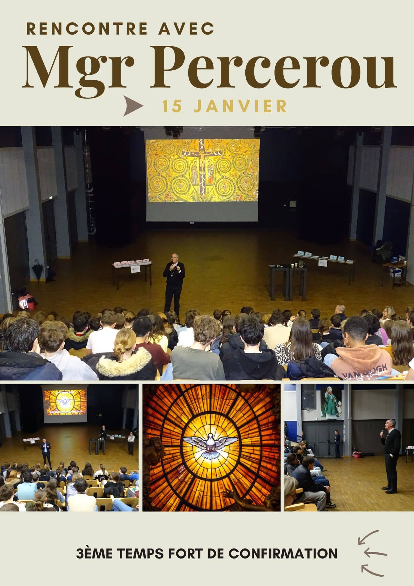 Rencontre avec l’Evêque Jeudi 15 janvier, Monseigneur Laurent Percerou s’est déplacé tout spécialement pour rencontrer les quelque 120 élèves de 3ème des collèges Chavagnes et Externat